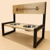 Comedor para mascotas fabricado en madera de pino barnizada. Diseño resistente, ergonómico y decorativo con espacios para dos platos. Ideal para perros o gatos.