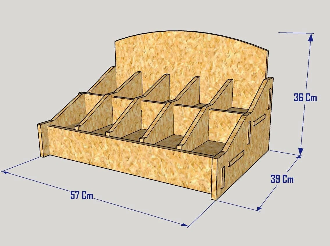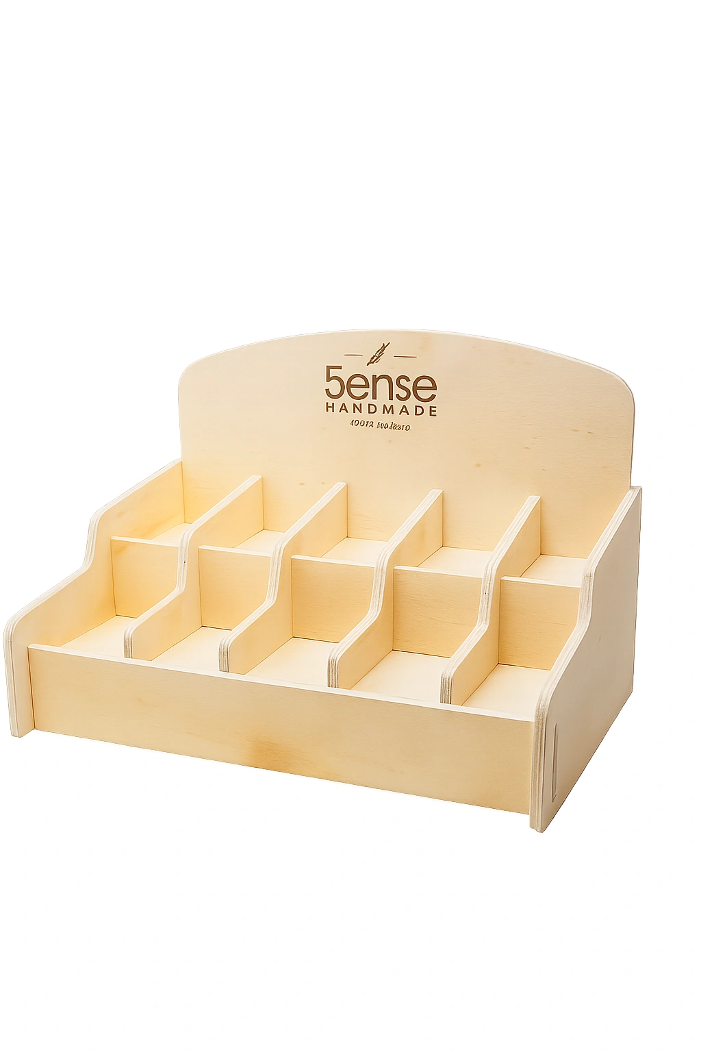 Presenta tus productos de manera elegante y profesional con este exhibidor de triplay fenólico, diseñado con 8 compartimientos escalonados que permiten una excelente organización y visibilidad. Perfecto para productos artesanales, cosmética natural, alimentos empacados o artículos decorativos.