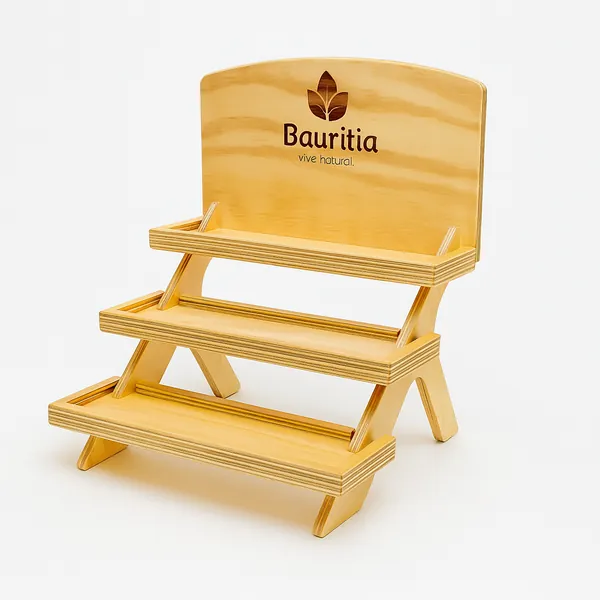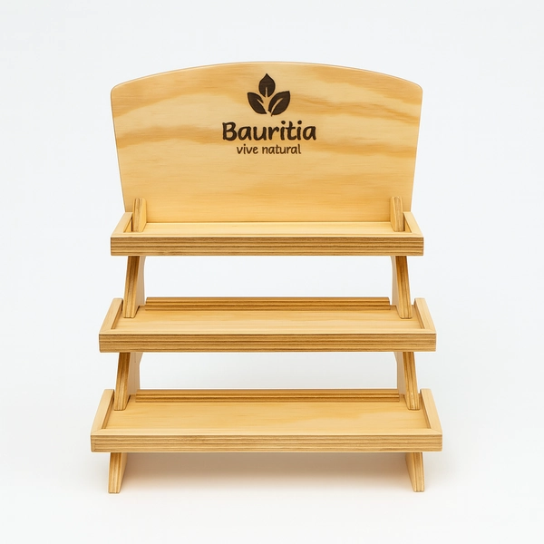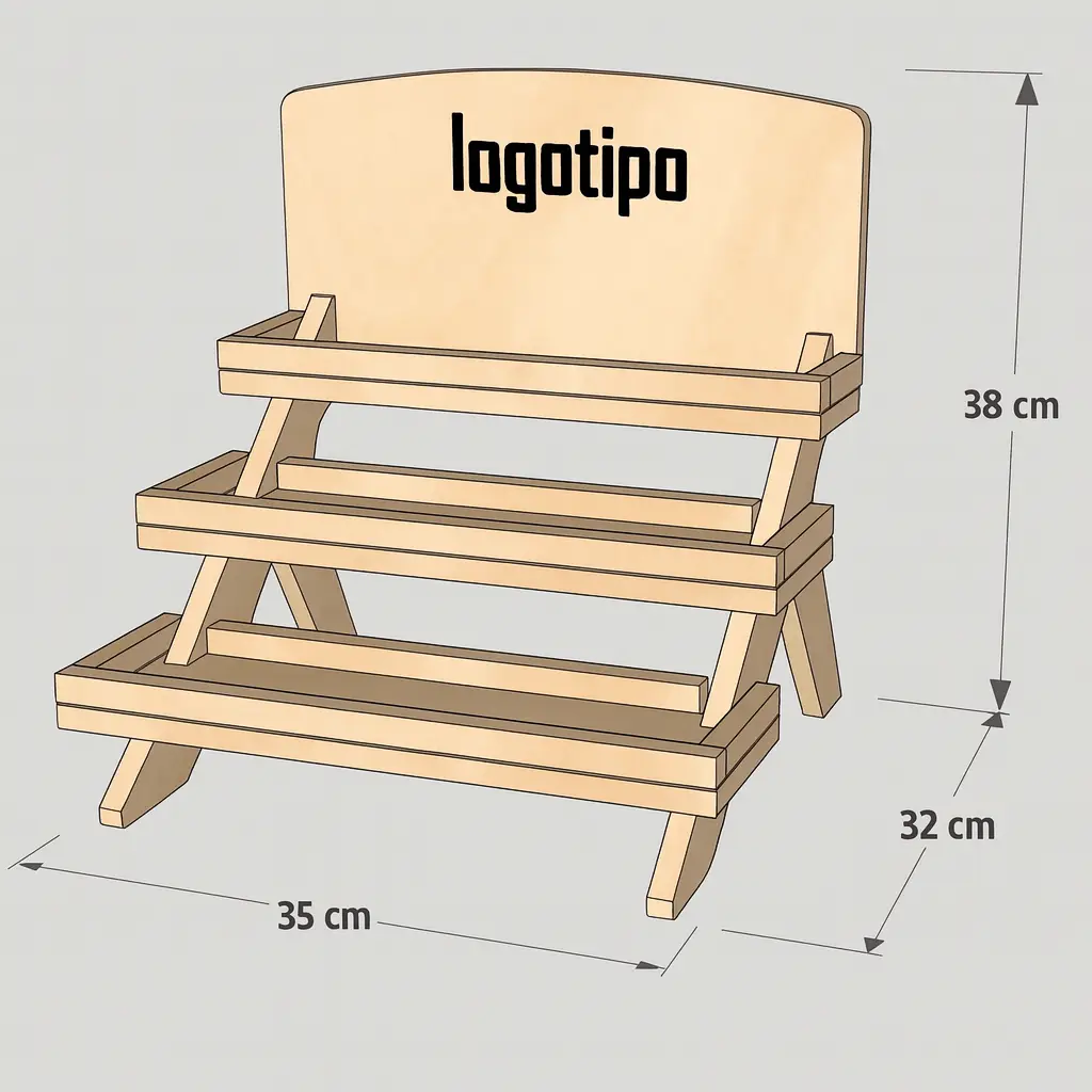 Creado para dominar cualquier sobremesa, este display de madera de 3 niveles está fabricado en robusta Triplay fenólico de 15 mm de espesor. Sus dimensiones son un estudio de la perfección compacta: 38 cm de altura para que tus productos se vean por encima de la competencia, 35 cm de ancho para mostrar tu variedad sin amontonar, y 32 cm de fondo para una base sólida como una roca. El acabado en barniz brillante le da ese toque premium que grita «calidad». Y porque sabemos que tu negocio no para, es 100% desarmable. Llévalo contigo, móntalo en segundos y conquista. ¿La cereza del pastel? La base personalizada está esperando tu logo para que nadie olvide quién manda.