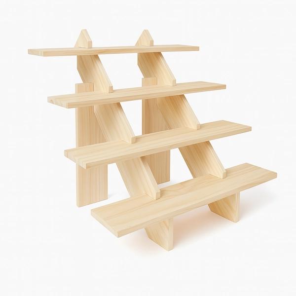 Destaca tus productos con este exhibidor de madera estilo escalera, diseñado con una estructura piramidal de 4 niveles. Ideal para tiendas, mercados, ferias artesanales, cafeterías o decoración interior.