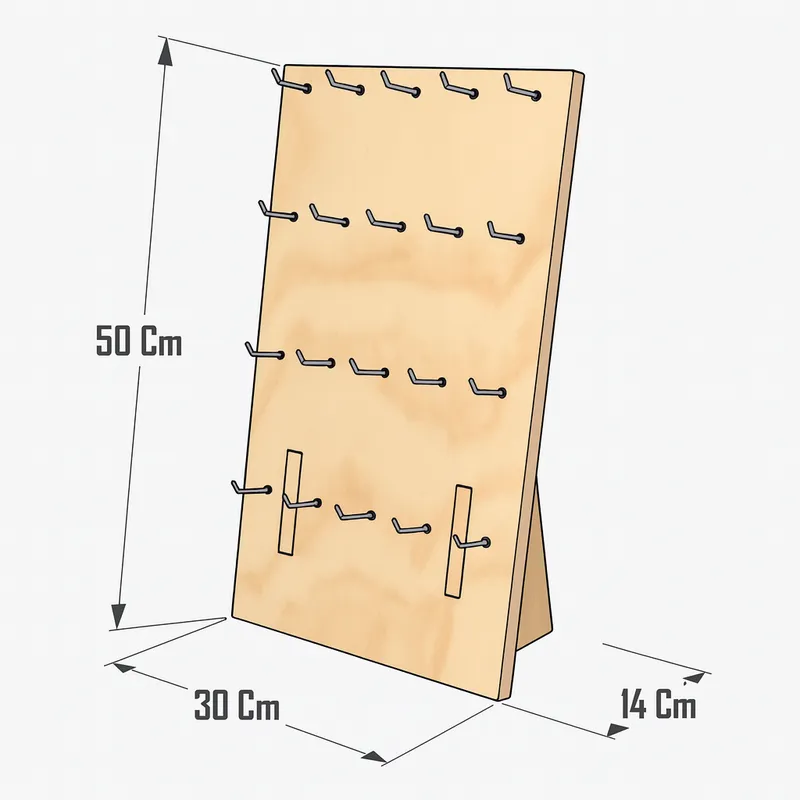 Este práctico exhibidor de madera de pino con 15 mm de espesor y acabado en barniz transparente es ideal para organizar y mostrar productos de forma ordenada y atractiva. Su diseño inclinado con base de apoyo lo convierte en una pieza versátil para tiendas, ferias, stands y uso doméstico.